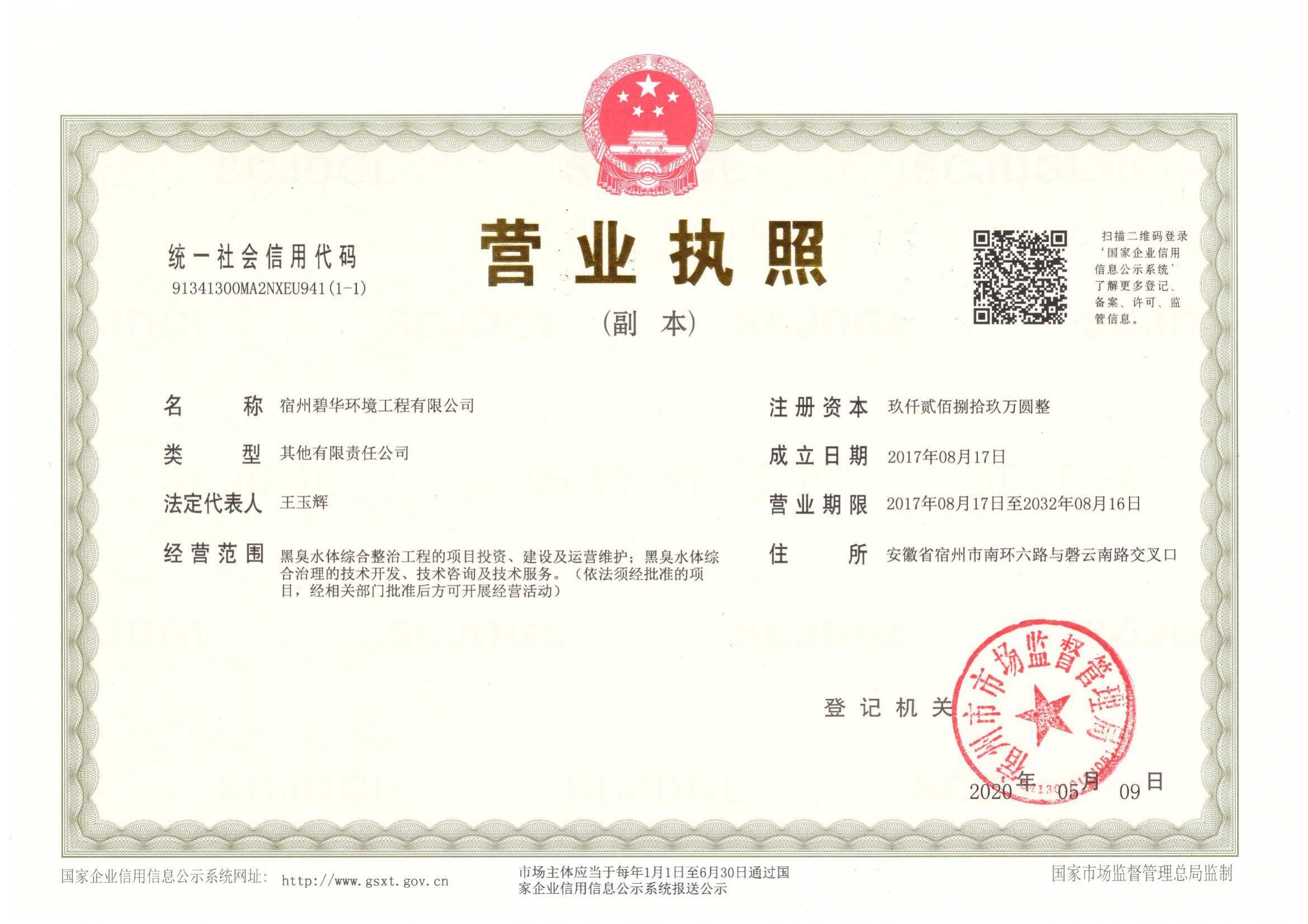 宿州碧华环境工程有限公司由天行平台_天行(中国)一站式服务平台与北京碧水源科技股份有限公司、宿州市城市建设投资集团(控股)有限公司共同设立,注册资本9289万元,其中天行平台_天行(中国)一站式服务平台持股44%。经营范围包括黑臭水体综合整治工程的项目投资、建设及运营维护;黑臭水体综合治理的技术开发、技术咨询及技术服务等业务。