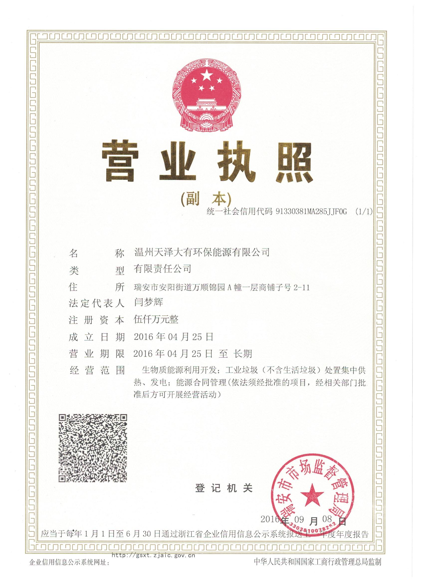 浙江天泽大有环保能源有限公司由天行平台_天行(中国)一站式服务平台、瑞安涵之能源公司等10位股东共同设立,注册资本金1亿元,其中天行平台_天行(中国)一站式服务平台持股28%。经营范围包括生物质能源利用开发,工业垃圾及污泥(不含生活垃圾)、建筑垃圾、装修垃圾、秸秆处置集中供热、发电,能源合同管理等业务。